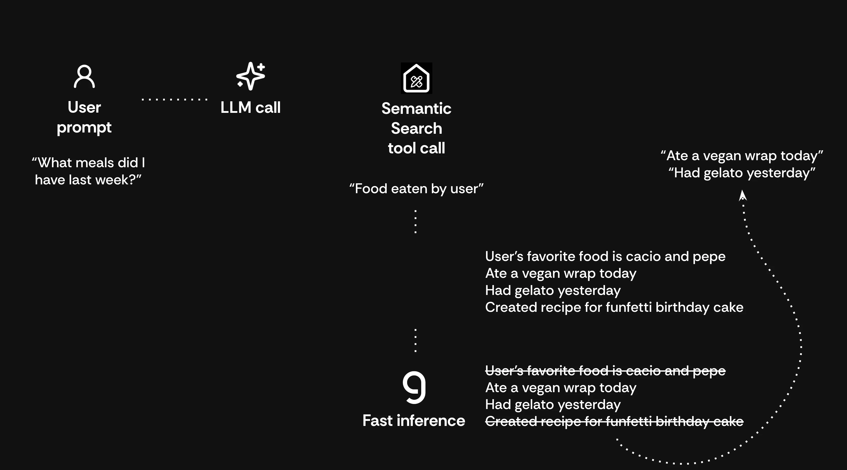 Every time the LLM requires a memory from the user, it creates a semantic query (for example, a phrase), and sends its query to the Semantic Memory Search tool. The tool will look into past contexts, then make an inference call to filter and return memories that are relevant to the initial query. The result is returned to the LLM.